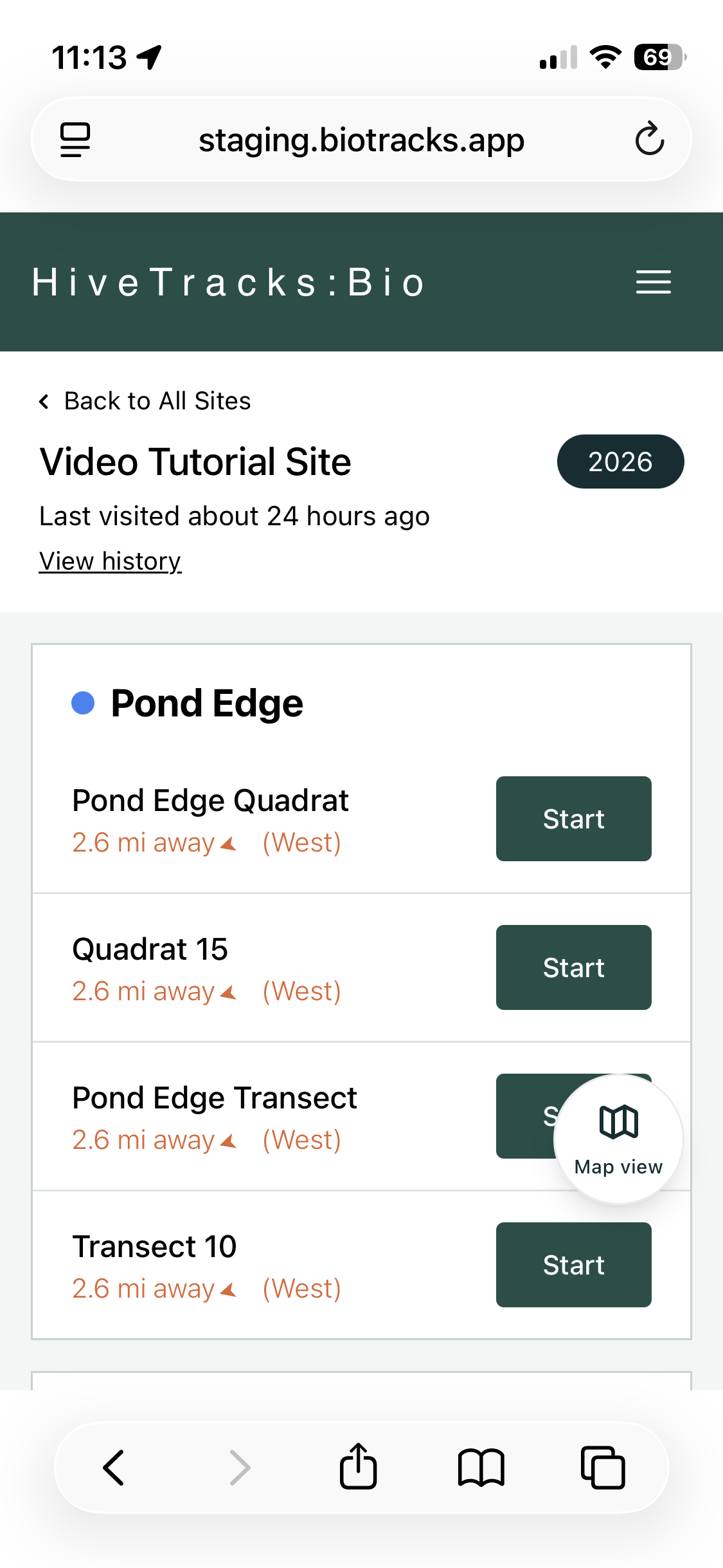 - Once on your site's page, press the corresponding start button for the Quadrat you would like to visit