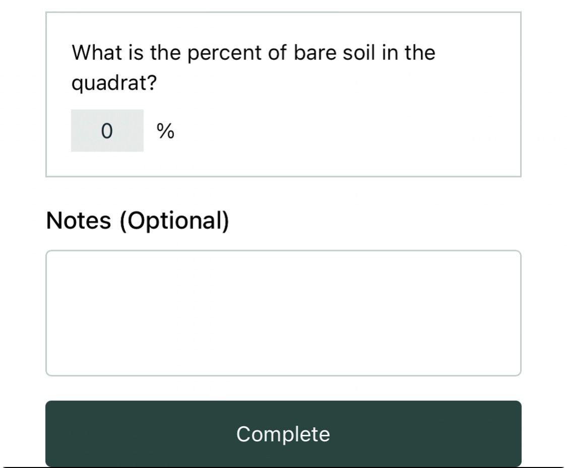 12. Fill out the bare soil percentage and any notes for your Quadrat. Once you are finished, press the Complete button.