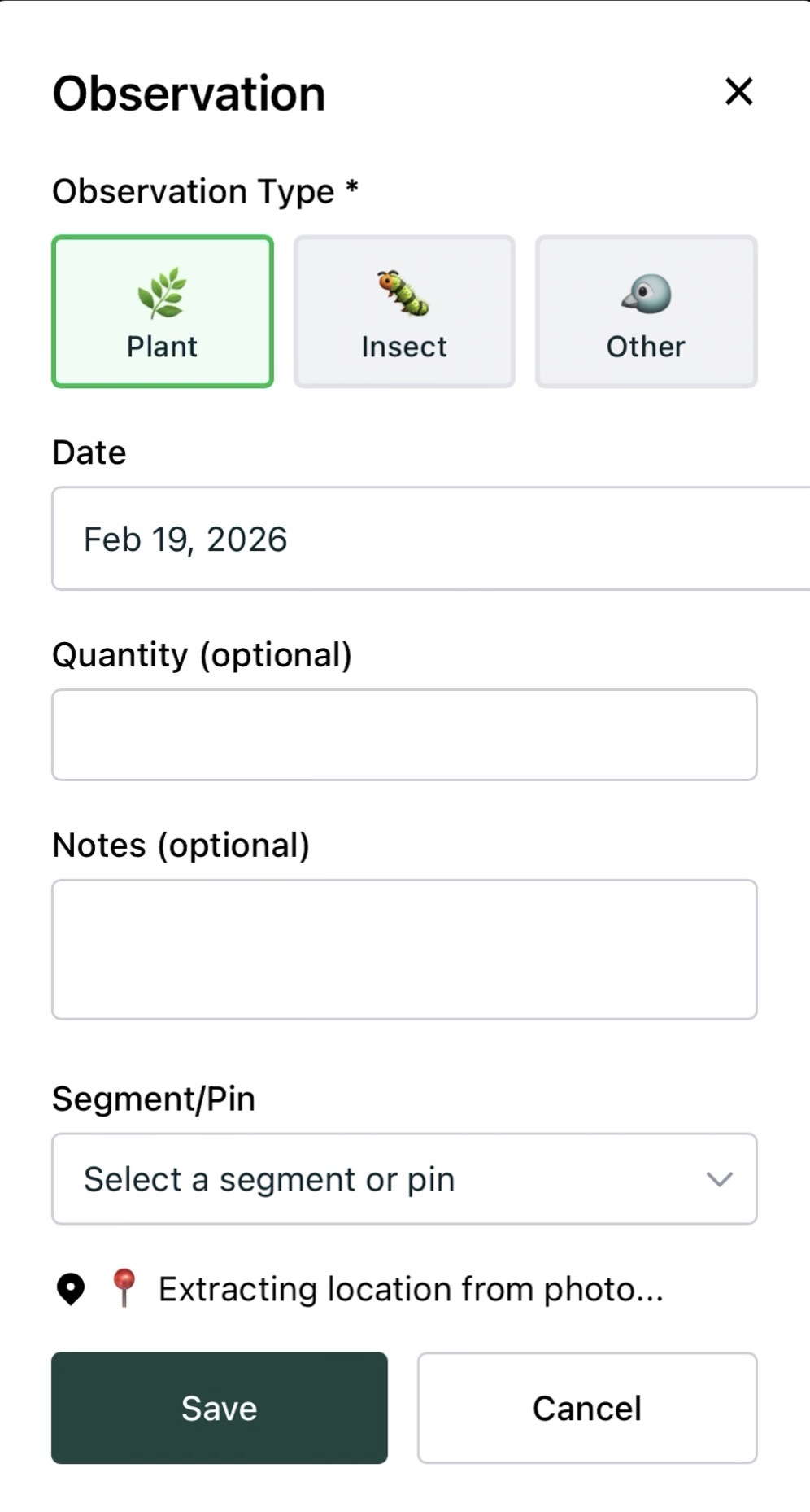 5. After taking a photo of your observation, identify if it was a Plant, Insect, or Other. On this page, you can edit the date, quantity, add notes, and select which pin or segment the observation is associated with.